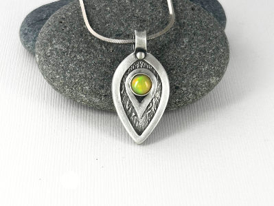 I crafted this necklace in my home studio using sterling silver clay and an Ethiopian opal. During the greenware stage—when the material is dried but not yet fired—I refine, sand, and carve the piece. Subsequently, I fire my creations in an electronically controlled kiln for the maximum allotted time, ensuring the production of high-quality jewelry.