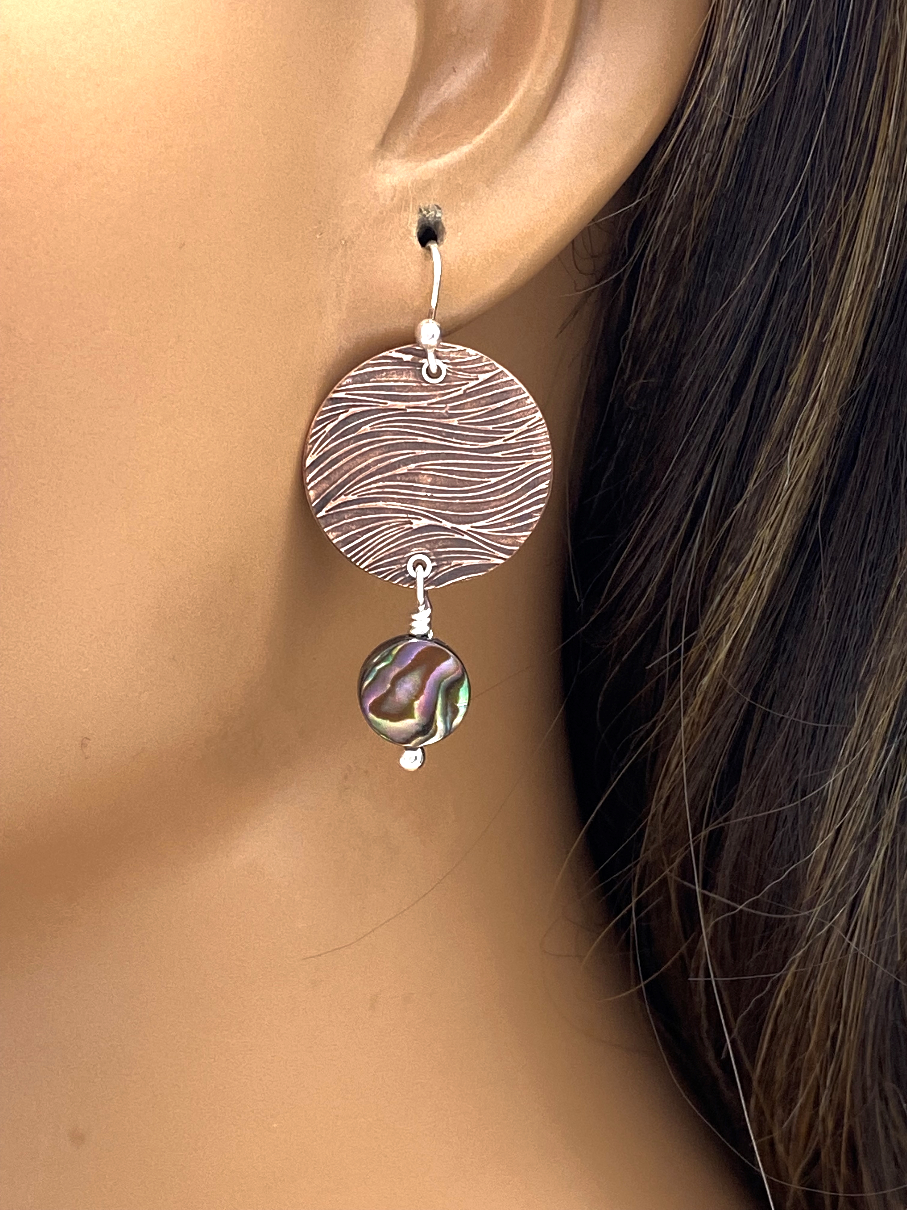 Copper Abalone Round Handmade Dangle Earrings made with Copper Metal Clay. I chose a texture for the copper circles to compliment the abalone shell beads. Perfect gift for someone who loves handmade artisan jewelry. These Boho earrings would make a nice addition to your Boho jewelry collection.
