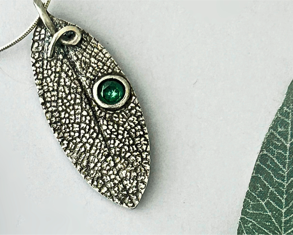 I handcrafted this artisan piece as a testament to the beauty of nature. Crafted from sterling silver metal clay, the pendant captures the intricate details of a real sage leaf, immortalized through a two-sided mold. The pendant not only embodies the essence of natural elegance but also showcases a harmonious blend of textures and materials. The addition of a vibrant green tourmaline crystal adds a touch of color and sophistication, enhancing the overall aesthetic and making it a standout accessory. This unique piece is perfect for those who appreciate the fusion of craftsmanship and nature, offering both visual appeal and a story of creativity and inspiration.