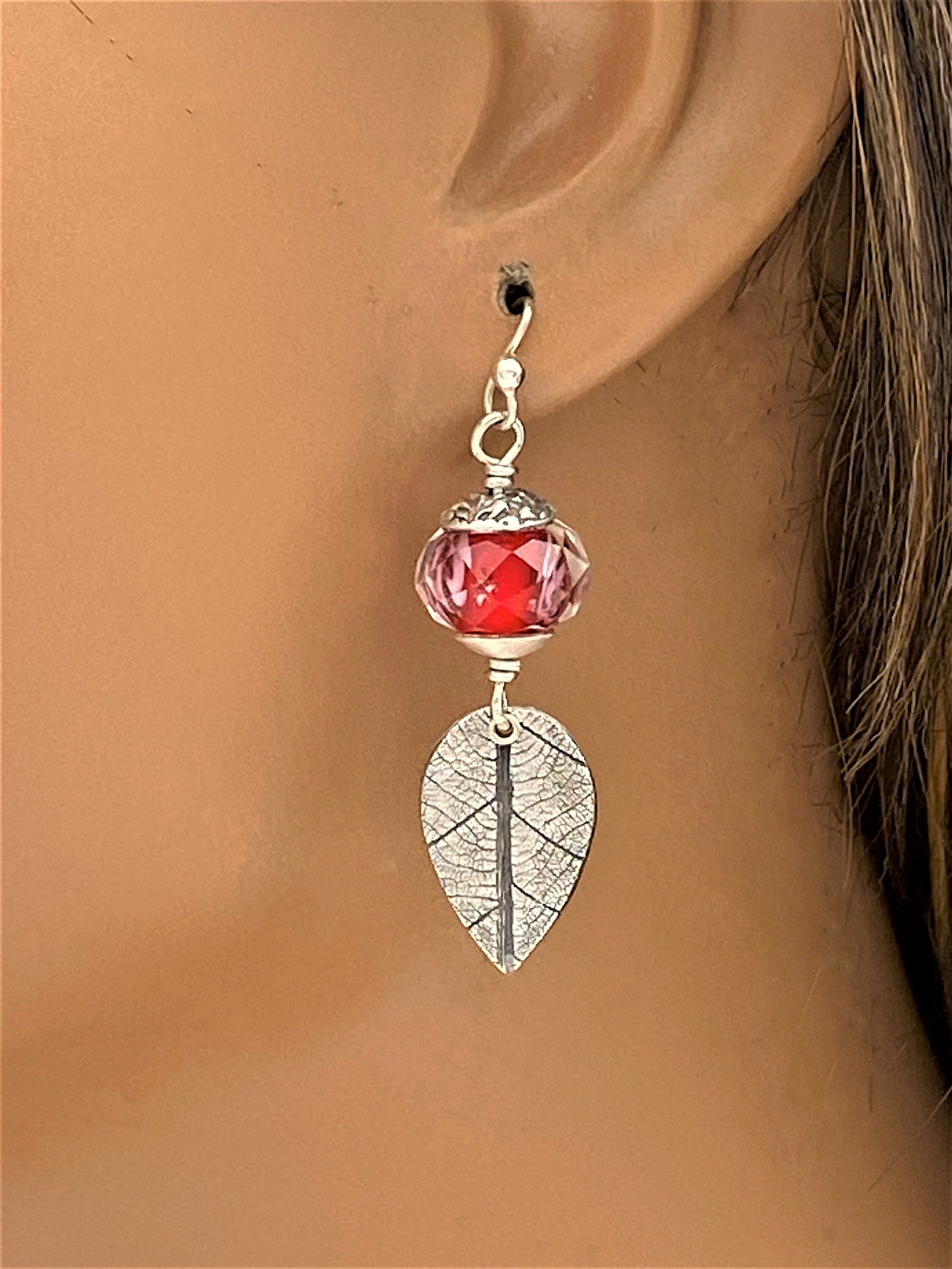I made the leafs with sterling silver metal clay. I created the top bead caps with sterling clay and the bottom bead caps with sterling sheet. I completed the leaves with a eyelet rivet for a nice finished look. The ear wires are sterling silver. Perfect gift for someone who loves a handmade artisan piece of jewelry.