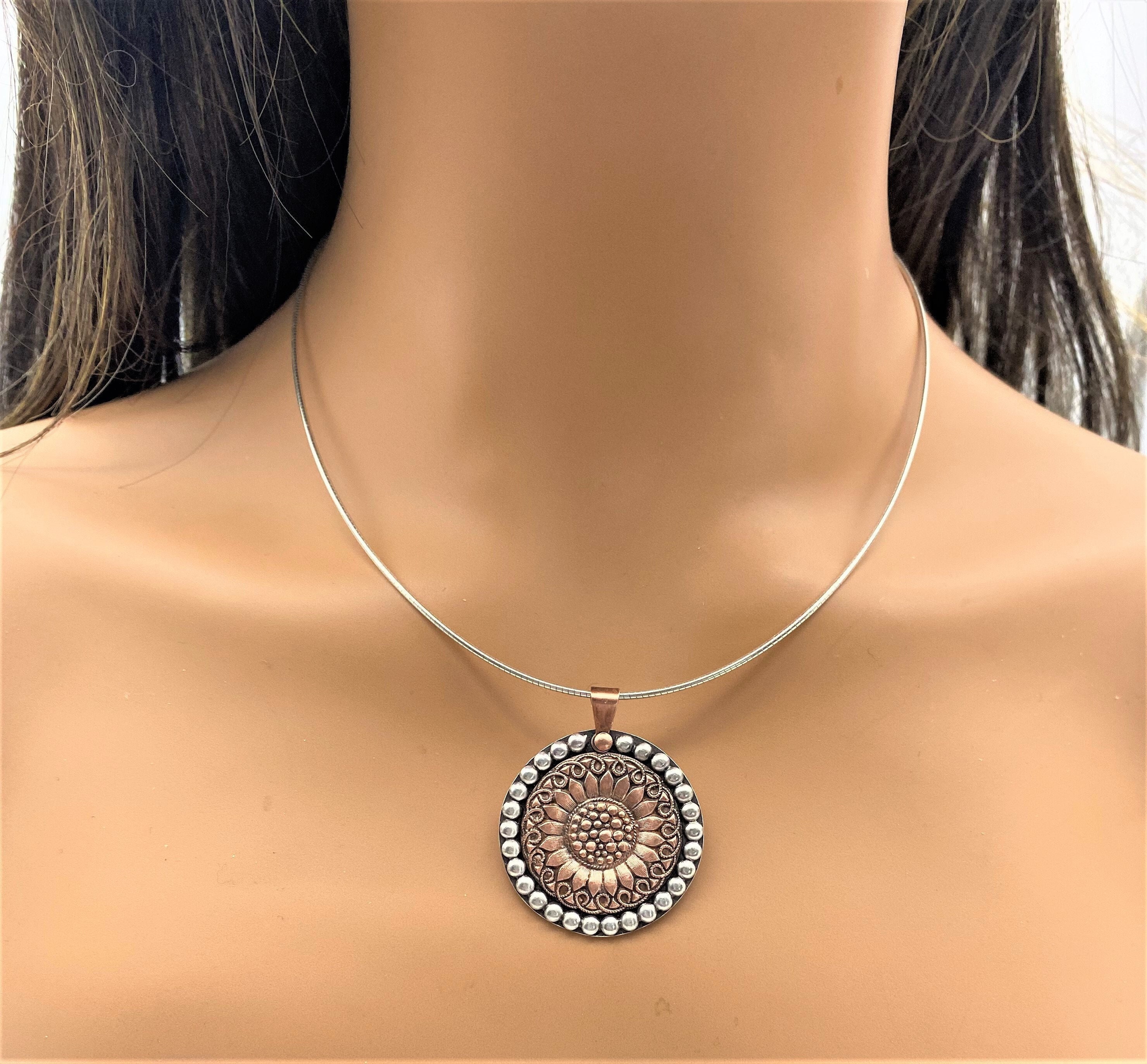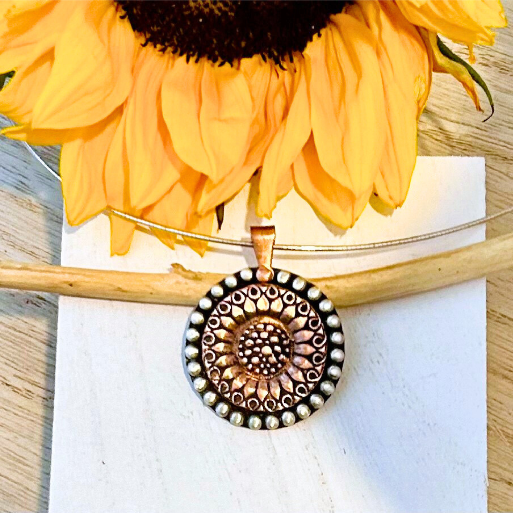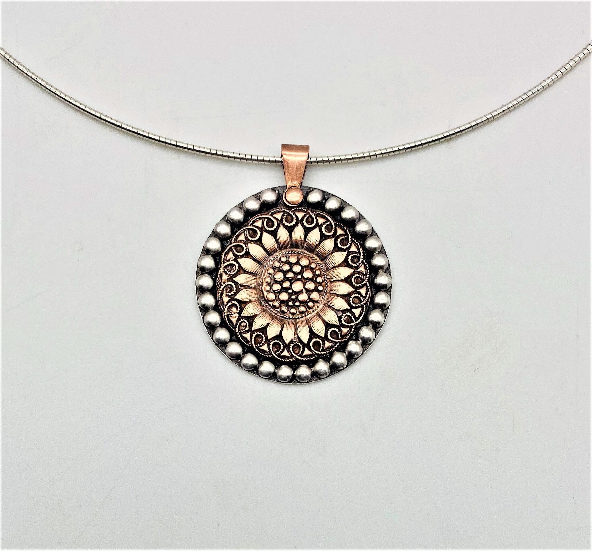 I created this necklace with a wonderfully detailed sunflower mold, copper clay, sterling silver sheet, and sterling silver beaded wire. After firing the copper clay sunflower, I soldered it on sterling silver sheet framing with the beaded wire. I cut the final shape with a jeweler's saw. Then polished and added a copper riveted bail.